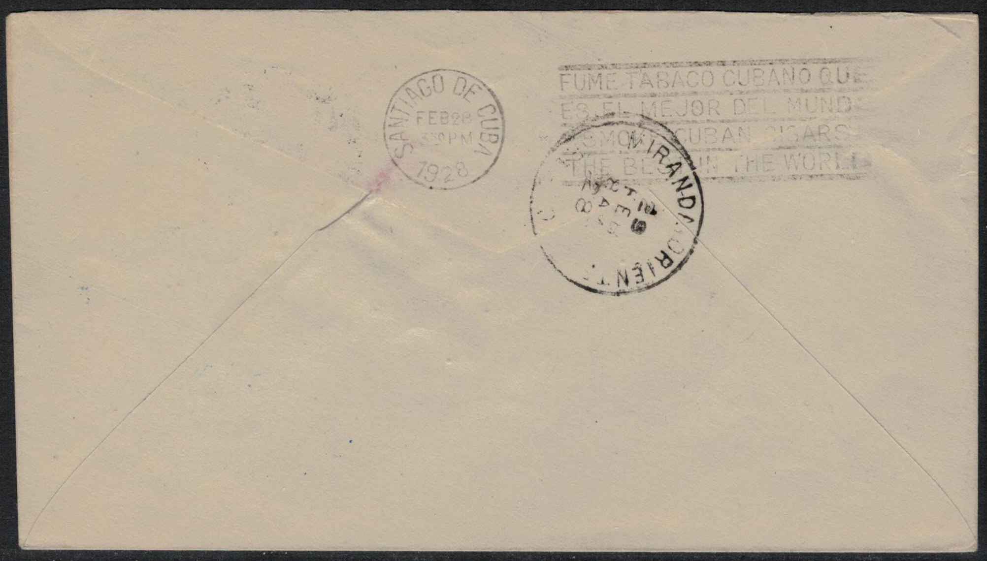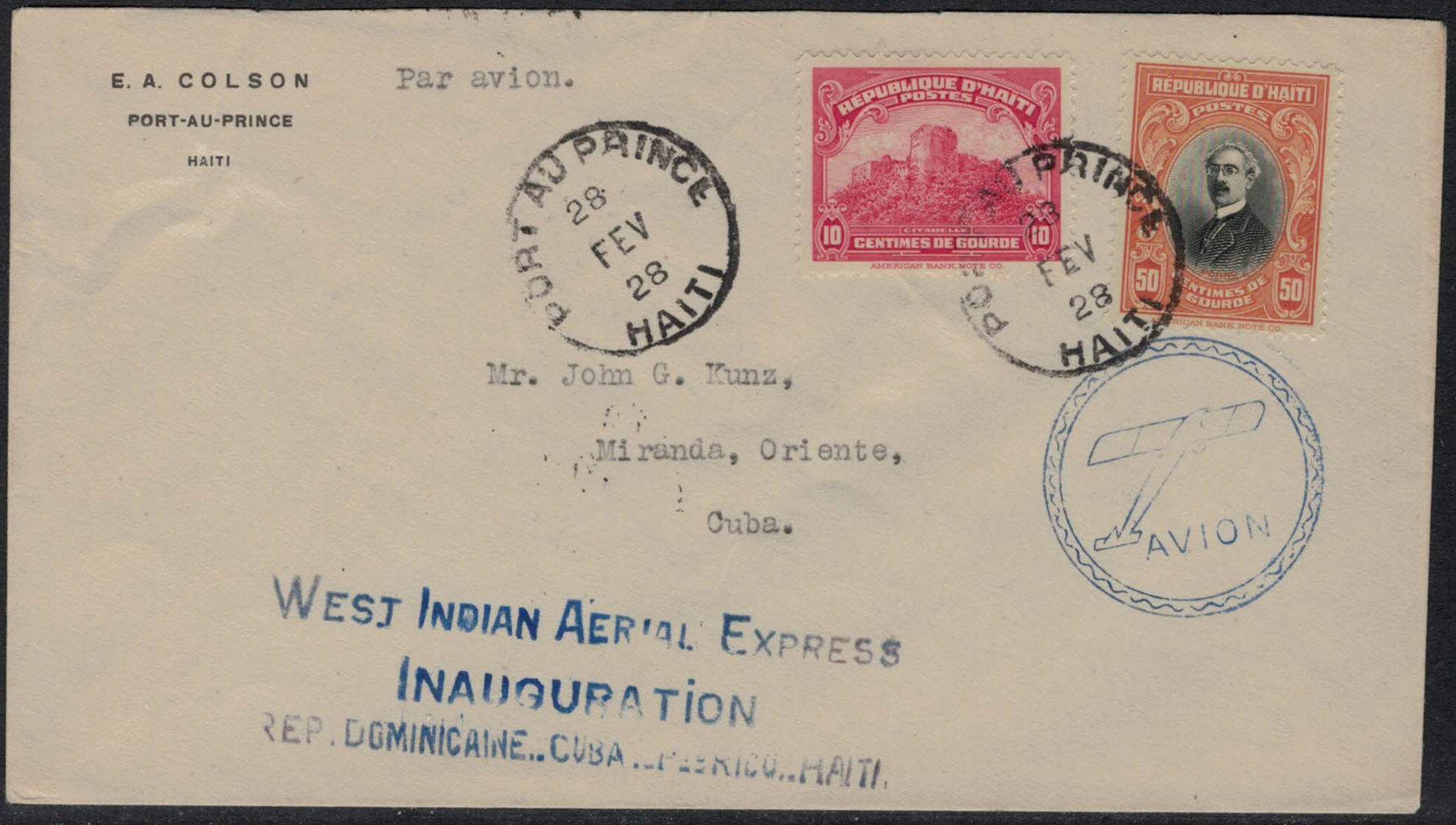 | 28 | First flight cover, Port-au-Prince (28 February 1928) to Miranda, Cuba, arriving 28 February 1928. Flight #WI-7. AVION cachet. Excellent condition. Levine First Flights Catalog value: $40.00.  | 18.75 | 18.75 |