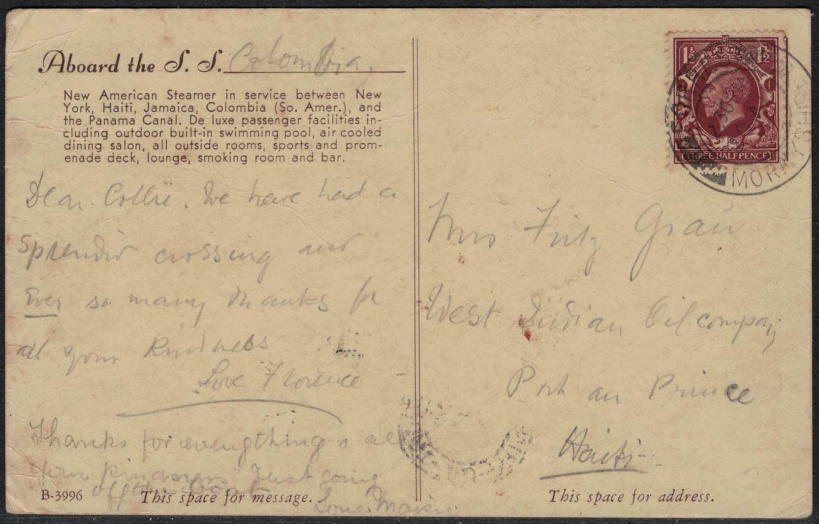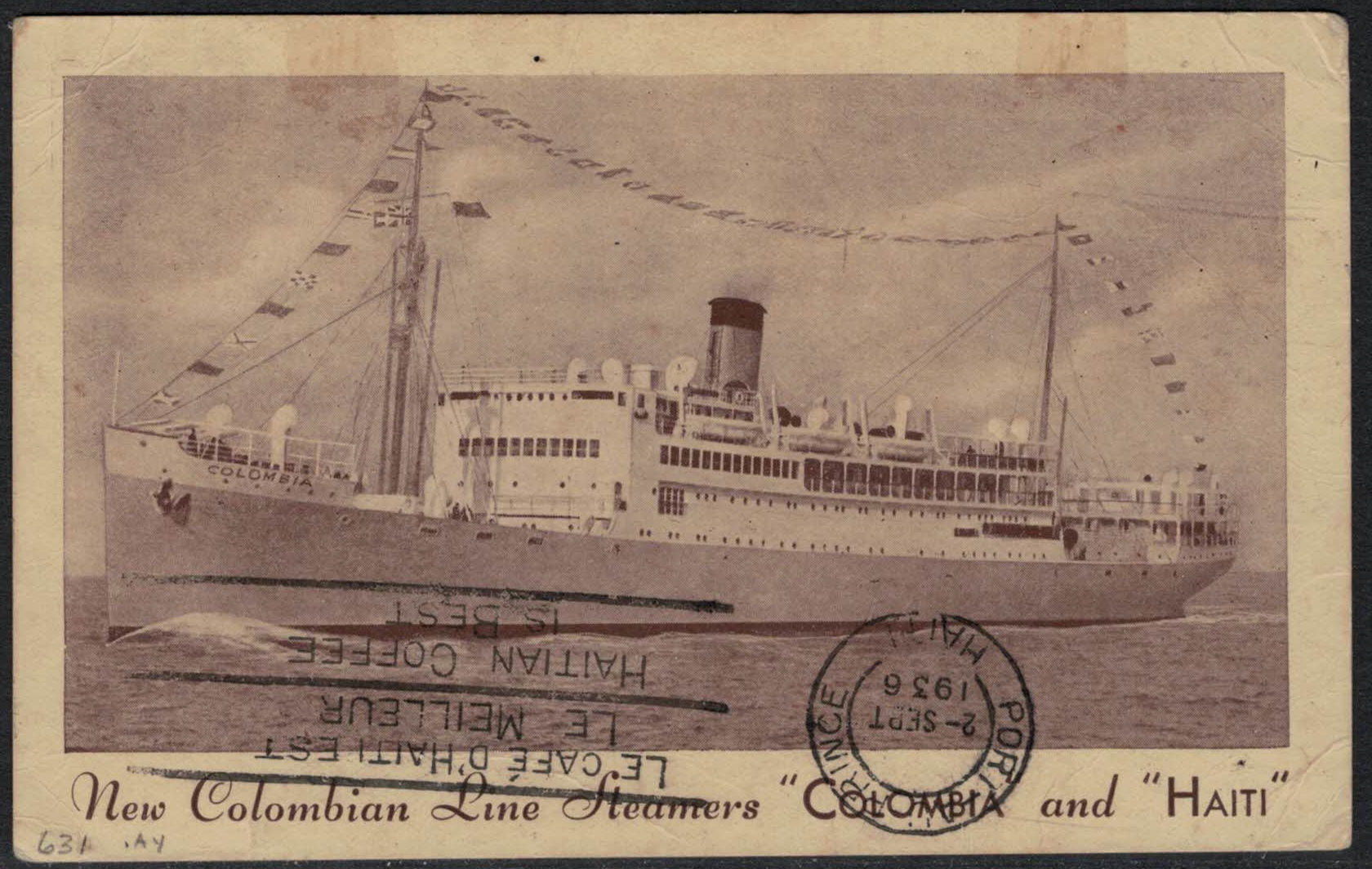 | 30 | Postcard, New Colombian Line Steamers mailing. British postal cancellation unreadable. Addressed to Port-au-Prince, receiving on 2 September 1936. Fine condition.  | 3.25 | 3.25 |