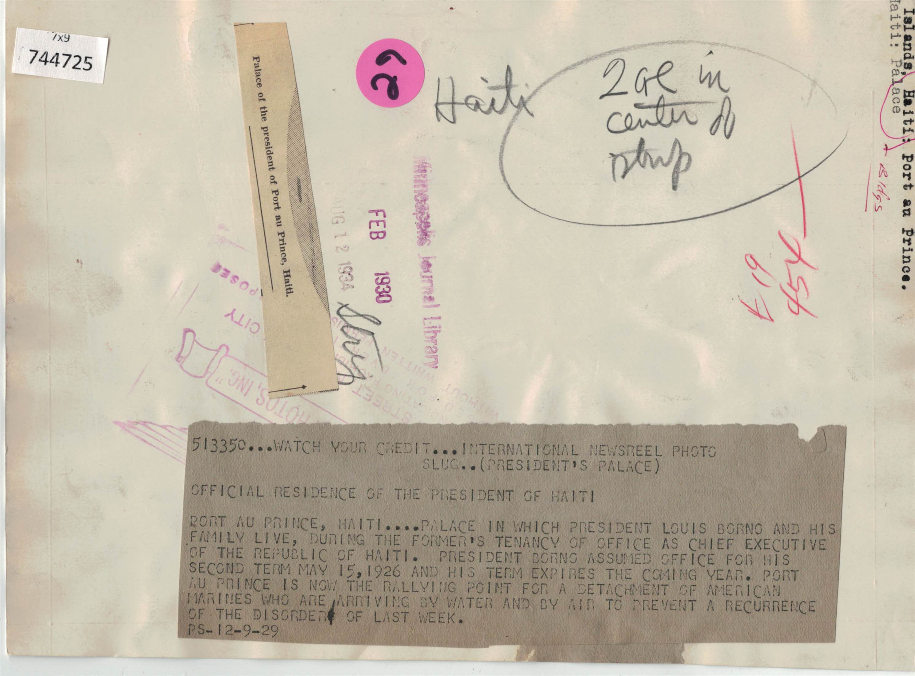 | 31 | Historical photo (approx. 8”x10”) of Haiti's National Palace, circa 1929. International Newsreel photo slug and inscriptions on back. See scans.  | 1.00 | 3.00 |